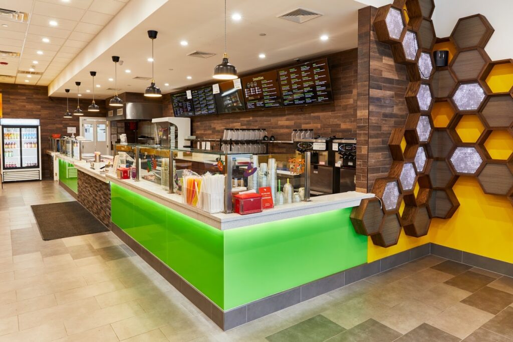 Materiality is central to the design intent. Warm wood tones are paired with a vibrant color palette to create contrast between tactile surfaces and graphic clarity. The restrained material selection reinforces brand recognition while fostering a welcoming, human-scaled atmosphere within a high-traffic commercial setting.