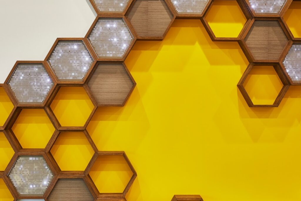 The primary architectural gesture is a honeycomb-inspired wall system reflecting the brand, derived from natural geometry and realized through precise digital fabrication. A field of hexagonal modules creates a rhythmic backdrop that balances repetition with variation- combining solid, perforated, and open frames. Select modules integrate LED lighting, introducing depth, visual hierarchy, and subtle animation that guides the customer’s fun and dynamic experience across the space.